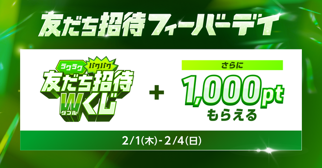 2024年2月1日(木)〜2024年2月4日(日)の期間中、友だち招待を成功すると通常の友だち招待くじに加え、さらに追加ボーナスとして1,000ptを後日プレゼントいたします。