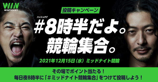 2021年12月18日(土)から俳優の窪塚洋介さん、オダギリジョーさんを起用した全国でのTVCM「8時半だよ。競輪集合。」篇の放送を記念して、「【その場で当たる!】8時半だよ。競輪集合。Twitterキャンペーン」を開始します。