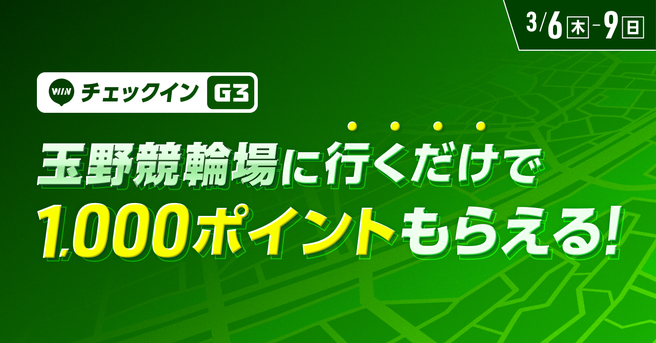 イベント開催中、WINTICKETアプリのチェックイン機能を玉野競輪場でご利用いただいたお客様に、1日あたり1,000ptをプレゼントします。