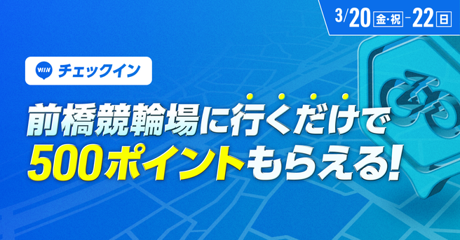 2026年3月20日(金・祝)〜 3月22日(日)の期間中、前橋競輪F1が開催される前橋競輪場におきまして、競輪場チェックインイベントを実施することをお知らせします。