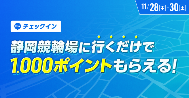 イベント開催中、WINTICKETアプリのチェックイン機能を静岡競輪場でご利用いただいたお客様に、1日あたり1,000ptをプレゼントします。