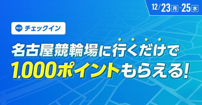 イベント開催中、WINTICKETアプリのチェックイン機能を名古屋競輪場でご利用いただいたお客様に、1日あたり1,000ptをプレゼントします。