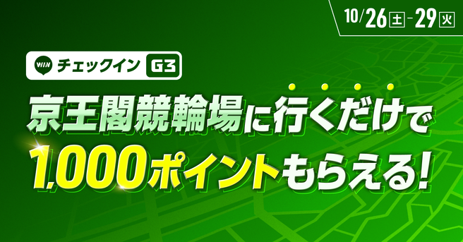 イベント開催中、WINTICKETアプリのチェックイン機能を京王閣競輪場でご利用いただいたお客様に、1日あたり1000ptをプレゼントします。