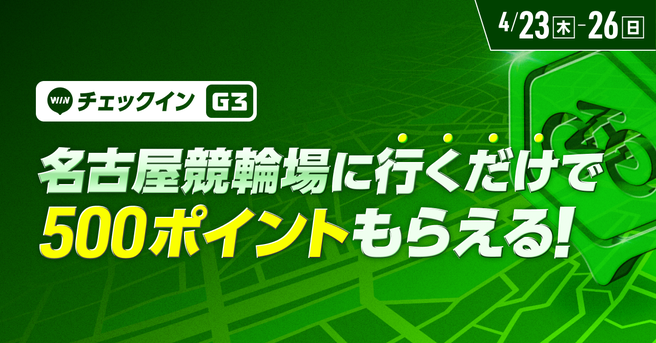 イベント開催中、WINTICKETアプリのチェックイン機能を名古屋競輪場でご利用いただいたお客様に、1日あたり500ptをプレゼントします。