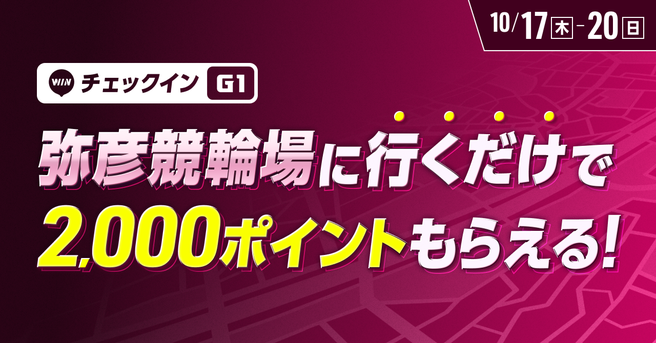 イベント開催中、WINTICKETアプリのチェックイン機能を弥彦競輪場でご利用いただいたお客様に、1日あたり2,000ptをプレゼントします。
