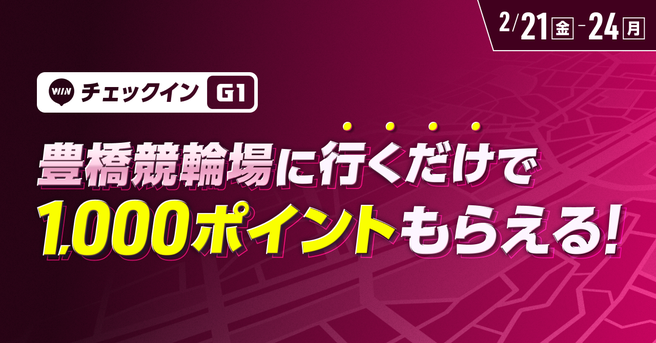イベント開催中、WINTICKETアプリのチェックイン機能を豊橋競輪場でご利用いただいたお客様に、1日あたり1,000ptをプレゼントします。