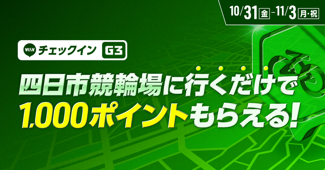 イベント開催中、WINTICKETアプリのチェックイン機能を四日市競輪場でご利用いただいたお客様に、1日あたり1,000ptをプレゼントします。