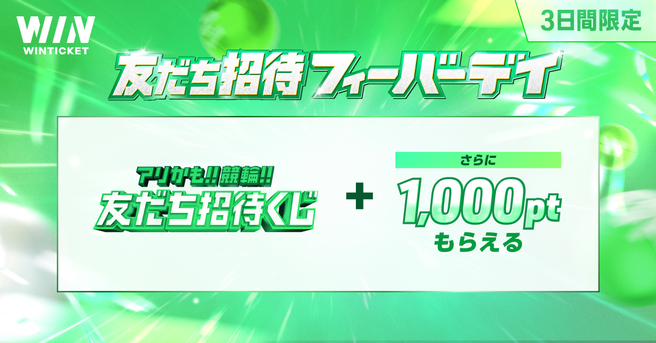 WINTICKETは、「1,000pt増量!友だち招待フィーバーデイ!」 として3日間限りの特別なキャンペーンを実施します。