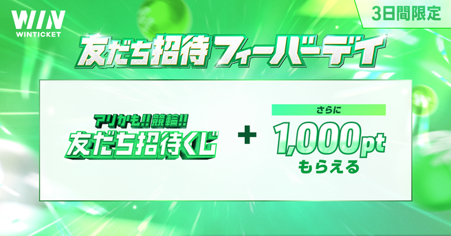 WINTICKETは、「1,000pt増量!友だち招待フィーバーデイ!」 として3日間限りの特別なキャンペーンを実施します。