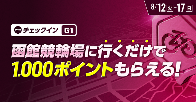 イベント開催中、WINTICKETアプリのチェックイン機能を函館競輪場でご利用いただいたお客様に、1日あたり1,000ptをプレゼントします。