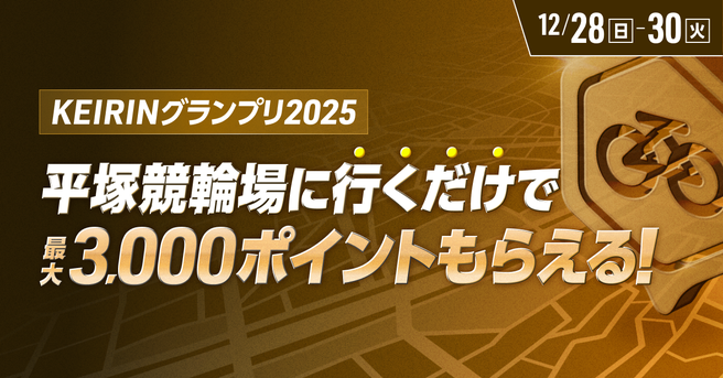 2025年12月28日(日) 〜 12月30日(火)の期間中、KEIRINグランプリ2025(GP)が開催される平塚競輪場におきまして、競輪場チェックインイベントを実施することをお知らせします。
