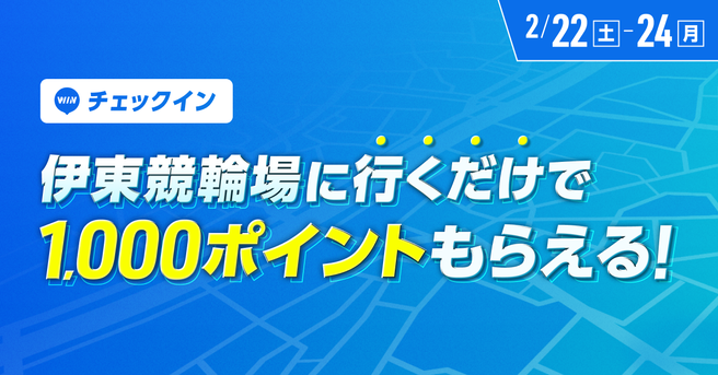 イベント開催中、WINTICKETアプリのチェックイン機能を伊東競輪場でご利用いただいたお客様に、1日あたり1,000ptをプレゼントします。