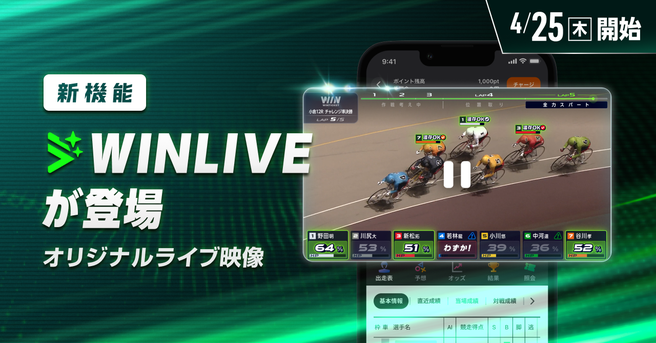 WINLIVE は、よりたくさんの方に競輪を楽しんでもらいたいという思いからWINTICKETが独自に開発した、新しいライブ映像です。